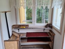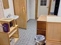 saunan pukuhuoneen lattia remontoitu 2000-luvun puolella, siinä muovimatto.