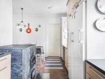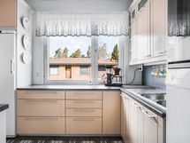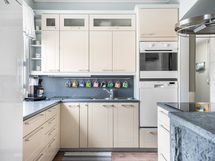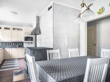 Keittiön varusteet: Uuni, astianpesukone, jääkaappi, erillinen pakastin, liesituuletin ja kiinteät valaisimet. Liesi: Keraaminen liesi ja leivinuuni. Työtason materiaali: Laminaatti.