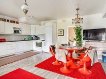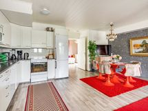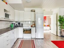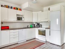 - Keittiön varusteet: Jääkaappipakastin, liesi, astianpesukone ja liesituuletin. Liesi: Keraaminen liesi. Työtason materiaali: Laminaatti. Tilava avokeittiö.