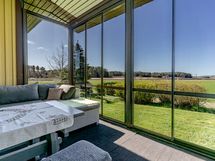 o Lasitettu 24 m2 suuruinen terassi liukuovin katsoo esteettömästi aurinkoon länsi- lounaaseen ja siihen on pääsy allashuoneesta. Terassin kokonaisala on 40 m2.