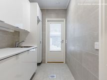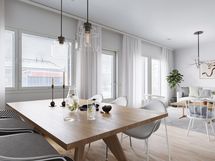 - jääkaappi/pakastin, induktioliesi, erillisuuni, astianpesukone ja liesituuletin. Tasot laminaattia, keittiön kalusteväliin asennetaan välitilalevy. Ovet, tasot, vetimet valittavissa kalustetoimittajalta. Lattia parkettia, seinät maalattu.