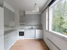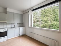- Keittiön varusteet: Jääkaappipakastin, liesi, uuni, liesituuletin ja astianpesukone. Liesi: Keraaminen liesi. Työtason materiaali: Laminaatti.