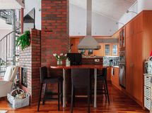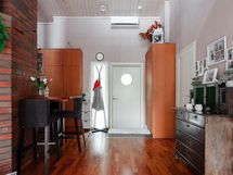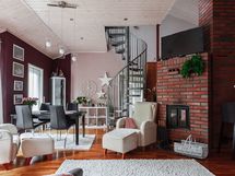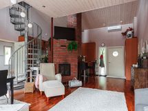 Keittiö: parketti Makuuhuone: Alakerrassa parkettia, yläkerta laminaattia Kylpyhuone: laatta Olohuone: parketti