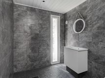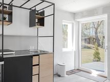Keittiö on pieni, mutta sitä on mahdollista laajentaa ruokailuhuoneeseen, mikä lisäisi tilan käyttömahdollisuuksia. Makuuhuoneessa on lautalattia ja koko seinän levyinen hyllyjärjestelmä, joka tarjoaa runsaasti säilytystilaa. Kylpyhuone on tilava ja kaunis, ja kapea korkea ikkuna tuo tilaan valoa.