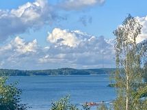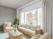 Olohuoneessa on korkea vino katto, jossa on vaalea kaunis rimapaneeli. Iso ikkuna tarjoaa upean merinäköalan. Ruokailuhuoneessa on ikkunat kahteen suuntaan. Isosta ikkunasta avautuu avoin näkymä merelle ja pienemmästä päätyikkunasta on metsäinen, osittain merellinen näkymä. Tästä huoneesta on käynti isolle terassille. Avotakka tarjoaa tunnelmaa syksyn pimeneviin iltoihin.