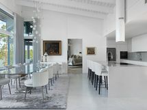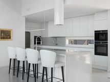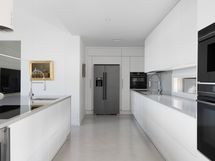 - Keittiön varusteet: Liesituuletin, astianpesukone, side-by-side jääkaappipakastin, kahvikone, viinikaappi, keittiösaareke, uuni ja liesi. Liesi: Induktioliesi. Työtason materiaali: Kvartsikomposiitti. Tyylikäs, valkoinen avokeittiö, jossa runsaasti säilytys- ja työtilaa. Siemensin laadukkaat kodinkoneet. Työtasot 30mm kvartsikiveä, kaksi allasta.