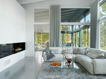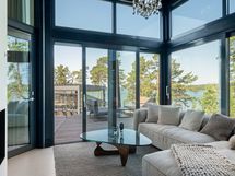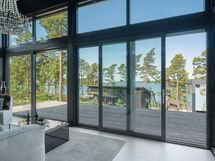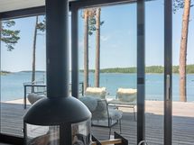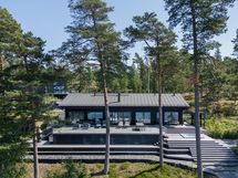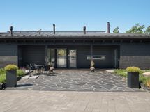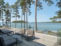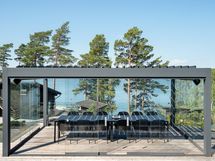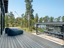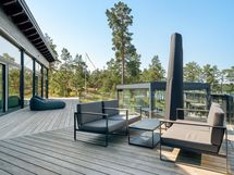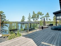 - Laajat lehtikuusiterassit kiertävät molempia rakennuksia. Niiden väliin jäävälle, liuskekivin laatoitetulle terassille paistaa aurinko koko päivän.