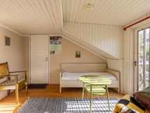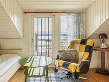 Huset är uppfört i två plan och rymmer bland annat ett vardagsrum med öppen spis samt ett kök i traditionell stugstil. På övre våningen finns ett sommarum och en stor vind som vid en renovering kan omvandlas till sovrum eller annat bostadsutrymme. Från verandan öppnar sig en fin vy mot havet som ger vardagen en tydlig känsla av skärgårdsliv.