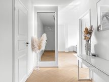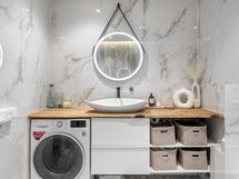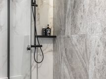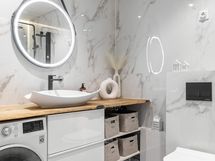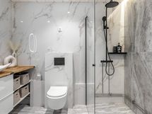 - Pesutilojen varusteet: WC-istuin, suihku, suihkuseinä, pesukoneliitäntä, lattialämmitys, peilikaappi, peili, pesuallas, allaskaappi ja bidee-suihku.