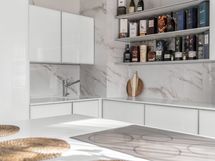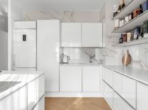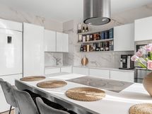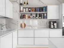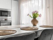 - Keittiön varusteet: Jääkaappi, erillinen pakastin, erillisuuni, liesi, liesituuletin, mikroaaltouuni, astianpesukone, keittiösaareke ja viinikaappi. Liesi: Induktioliesi. Työtason materiaali: Kivi. Keittiö täysin uusittu.