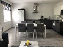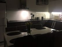 Tilaa isolle ruokapöydälle, Paljon kaappitilaa, Paljon työskentelytilaa, Laminaattitasot, Astianpesukone, Integroidut koneet, Pesukoneliitos, Induktioliesi, Liesituuletin, Jääkaappi