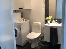 Suihku, Suihkuseinä, Pesukonevalmius, Allaskaappi, Laattaseinä, Halogeenivalot, Laattalattia, Peilikaappi, Lattialämmitys
