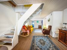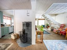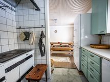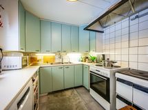 - Keittiön varusteet: Jääkaappi, uuni, liesi, liesituuletin ja astianpesukone. Liesi: Puuhella ja valurautaliesi. Työtason materiaali: Laminaatti.