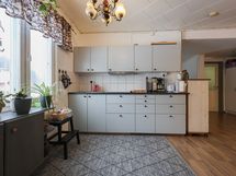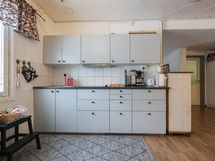 Liesi: sähköliesi. Työtasot: laminaatti. Kylmäsäilytys: jääkaappi, pakastin. Varustus: liesituuletin.
