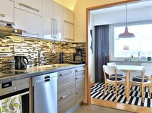 Liesi: keraaminen. Kylmäsäilytys: jääkaappi/pakastin. Varustus: liesituuletin, astianpesukone.