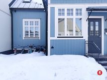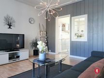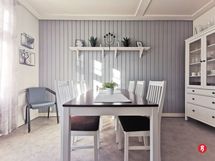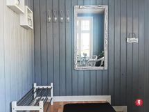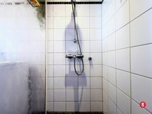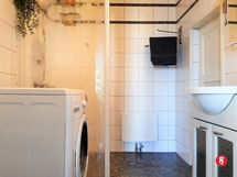 - Pesutilojen varusteet: WC-istuin (wc-stol), suihku (dusch), suihkuseinä (duschvägg), pesukoneliitäntä (annslutning till tvättmaskin), lattialämmitys (golvvärme), peili (spegel), pesuallas (håndfat) ja allaskaappi (skåp). Pesutilojen kuvaus: Kylpyhuoneen yhteydessä säilytystila ja valkoisen talon kellarissa huoneistoon kuuluva lämmin varasto.