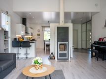 Det öppna vardagsrummet har en vacker ackumulerande spis som både höjer mysfaktorn och hjälper till att hålla uppvärmningskostnaderna nere. Boendekostnaderna är överlag mycket förmånliga tack vare ett lågt bolagsvederlag.