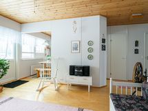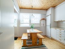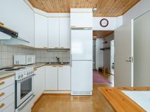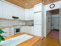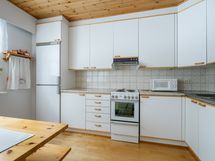 - Keittiön varusteet: Jääkaappi, erillinen pakastin, liesi, liesituuletin ja jääkaappipakastin. Liesi: Valurautaliesi. Työtason materiaali: Laminaatti.