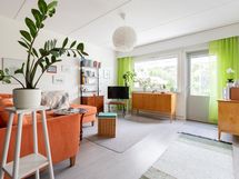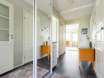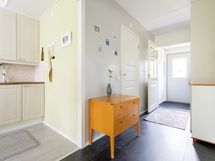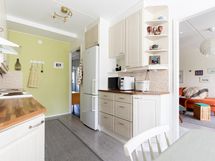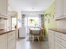 - Keittiössä vaaleat kaapistot, jääkaappipakastin, astianpesukone, liesi, liesituuletin, välitilassa laatta, tasot laminaattia, seinät maali / tapetti, lattia laminaattia.