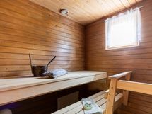 - Kuvaus: Saunassa sähkökiuas, lauteet, paneloitu, ikkuna.