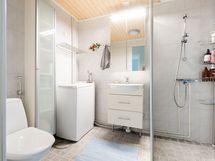 - Pesutilojen kuvaus: Kylpyhuoneessa suihku, suihkuseinä, wc, allaskaappi, peilikaappi, pk-liitäntä, laatta / kaakeli.