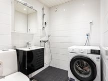 Varustus: pesukoneliitäntä, lattialämmitys, allaskaappi, peilikaappi ja kiinteät valaisimet.