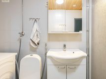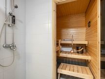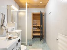 - Sauna, sähkökiuas, kylpyhuone, suihku, suihkuseinä, peilikaappi, kaappi, allaskaappi, pesukoneliitäntä, lattialämmitys.