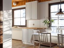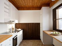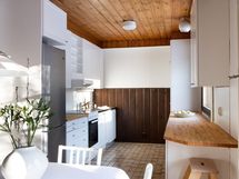 - Keittiössä on laatoitettu lattia sekä puolipaneloidut/ maalatut seinät ja laatoitettu välitila.