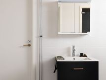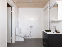 Allaskaappi, peilikaappi, kuivauspatteri, sadesuihku, wc-istuin, lattialämmitys. . Erillisen WC:n kuvaus: Wc:ssä on laatoitettu lattia ja laatoitetut/ paneloidut/ maalatut seinät.
