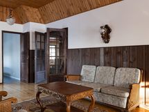 - Kuvaus: Saunassa on laatoitettu lattia ja paneloidut seinät.