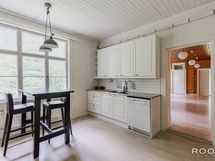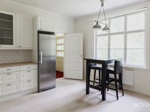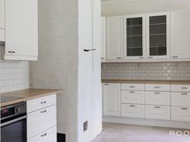 - Keittiön varusteet: Jääkaappi, erillinen pakastin (arkkupakastin), liesi (induktio), erillisuuni (integroitu), liesituuletin (hormiin liitetty) ja astianpesukone. Työtason materiaali: Laminaatti.