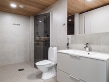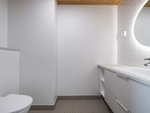 - Varustus: suihkuseinä, pesukoneliitäntä, lattialämmitys, wc-istuin, suihku, peilikaappi, peili, kiinteät valaisimet, kylpyhuonekaapisto. Varustus: lattialämmitys.