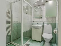 - Kylpyhuone, suihkukaappi, peilit, kaapit, pesukoneliitäntä, lattialämmitys sähköllä, kiinteät valaisimet. Pyyhepatteri