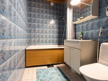 Toinen wc, muovimatto, kaakeli, lastulevy. Laattaseinät, amme, lattiakaivo.