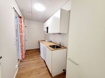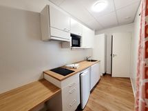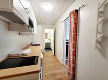 - Liesi: liesitaso. Työtasot: laminaatti. Kylmäsäilytys: jääkaappi. Varustus: mikroaaltouuni, astianpesukone, kiinteät valaisimet, liesituuletin / hormi. - matalampi taso ruokailua