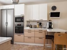 - Keittiön varusteet: Mikroaaltouuni, erillisuuni, astianpesukone, liesi ja festivo kylmiö. Liesi: Induktioliesi. Työtason materiaali: Kivi ja laminaatti. Puustellin keittiökaapit ja baarijakkarat, AEG-kodinkoneet.