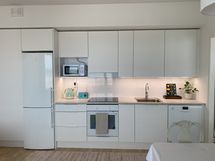 Liesi: erillisuuni, liesitaso. Kylmäsäilytys: jääkaappi/pakastin. Varustus: liesituuletin, astianpesukone.
