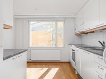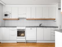 Jääkaappipakastin, keraaminen liesi, mikroaaltouuni, astianpesukone, kaapistot, kiinteät valaisimet.