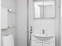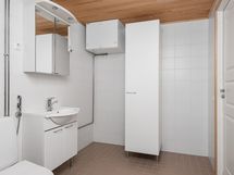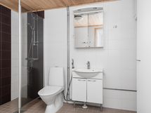 Sauna, sähkökiuas, kylpyhuone, erillinen wc, suihku, suihkuseinä, peilikaappi, kaapit, allaskaappi, lattialämmitys, kiinteät valaisimet.