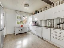 Jääkaappipakastin, erillisuuni, liesitaso, keraaminen liesi, liesituuletin, astianpesukone, kaapistot.