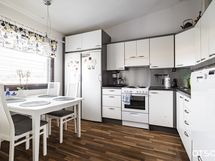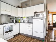 Keittiön varusteet: Jääkaappipakastin, liesi, liesituuletin ja astianpesukone. Liesi: Keraaminen liesi. Työtason materiaali: Laminaatti.