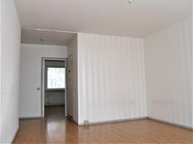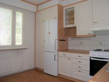 - vaaleat kaapistot, jääkaappipakastin, liesi, liesituuletin, seinillä maali, laminaattilattia