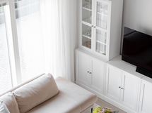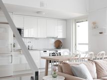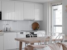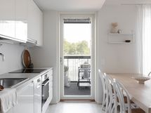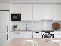 - Liesi: induktio, erillisuuni. Kylmäsäilytys: jääkaappi/pakastin. Varustus: liesituuletin, mikroaaltouuni, astianpesukone, kiinteät valaisimet. Puustellin kaapistot, AEG:n kodinkoneet.