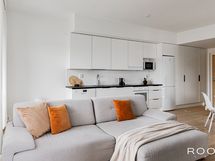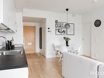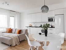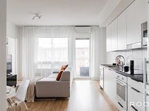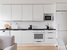 - Keittiön varusteet: Jääkaappipakastin, erillisuuni, liesituuletin, liesi ja astianpesukone. Liesi: Keraaminen liesi. Työtason materiaali: Laminaatti.
