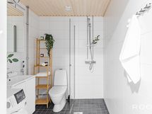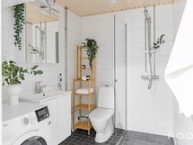 - Pesutilojen varusteet: WC-istuin, suihku, suihkuseinä, lattialämmitys, bidee-suihku, peilikaappi, pesuallas, allaskaappi, pesukoneliitäntä ja kiinteät valaisimet. Pesutilojen kuvaus: