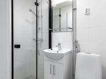- Pesutilojen varusteet: WC-istuin, suihku, suihkuseinä, peili, allaskaappi ja pesuallas.