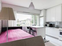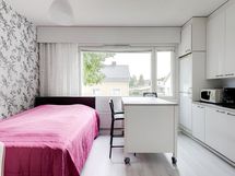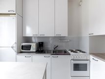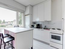 - Keittiön varusteet: Uuni, liesi, jääkaappipakastin ja keittiösaareke. Liesi: Valurautaliesi. Työtason materiaali: Laminaatti.