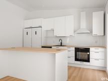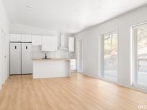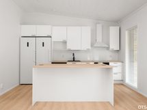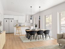 Upea keittiö ja olohuone, hyvin mahtuu kaikki huonekalut ja tila ikään kuin jatkuu hulppean kokoiselle terassille.