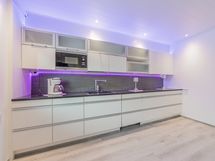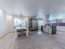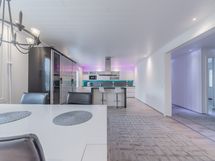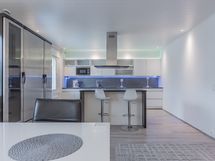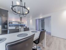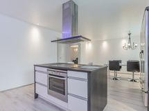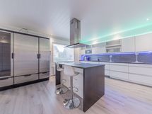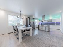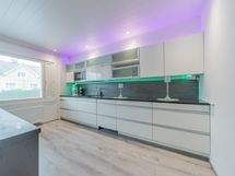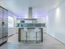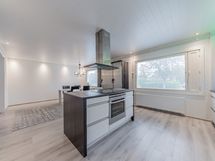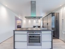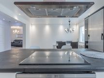 Alakerran upean iso keittiö, jossa todella paljon kaapistoa ja laatikostoa sekä paljon työtasoa. Iso saareke, jossa induktioliesitaso, alapuolellaan erillisuuni, yläpuolellaan liesituuletin. Seinustalla on integroitu astianpesukone sekä kalusteisiin asennettu mikro. Lisäksi keittiössä on upea kylmäkaappikokonaisuus, jossa jääkaappi, pakastin, vihanneslaatikko sekä viinikaappi. Keittiössä on myös hyvä paikka isolle ruokapöydälle.