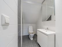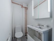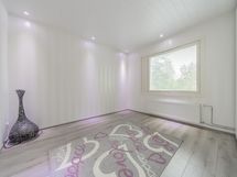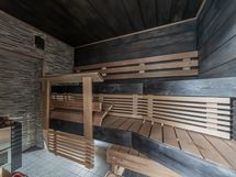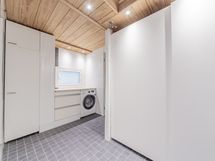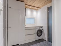 Ikkunallisessa kodinhoitohuoneessa on kaapistoa sekä pyykinpesukone odottelemassa käyttäjää. Ikkunallisessa kylpyhuoneessa on kaksi suihkua ja wc-istuin. Saunassa muhevat löylyt tarjoava puulämmitteinen kiuas, lauteilla tilaa isommallekin porukalle.